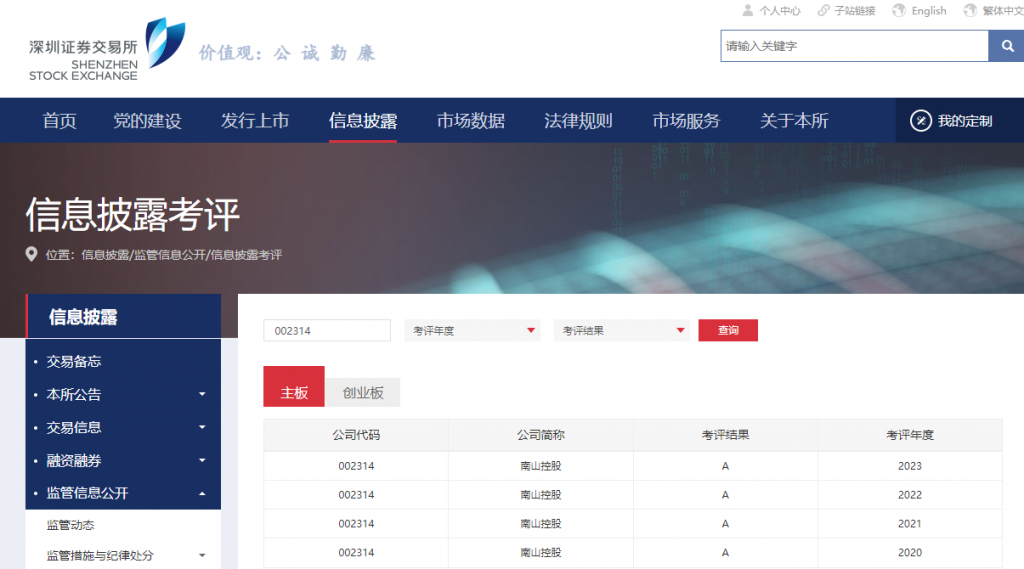 10月11日,深圳證券交易所(以下簡(jiǎn)稱“深交所”)發(fā)布《主板上市公司2023-2024年度信息披露工作評(píng)價(jià)結(jié)果》,南山控股信息披露工作再獲最高評(píng)級(jí)“A”級(jí),這是公司連續(xù)第四年獲此榮譽(yù)。